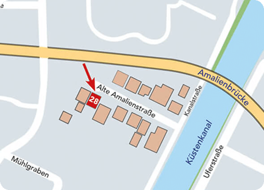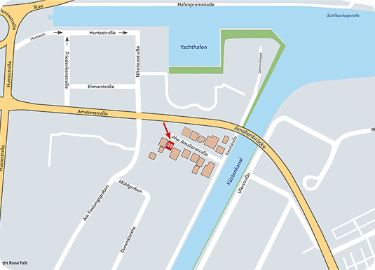 Bleiben Sie auf der Kanalstraße, bis auf der linken Seite ein Altenheim (Hansa-Seniorenzentrum) erscheint. Hinter dem Altenheim biegen Sie links in die Alte Amalienstraße ein.
