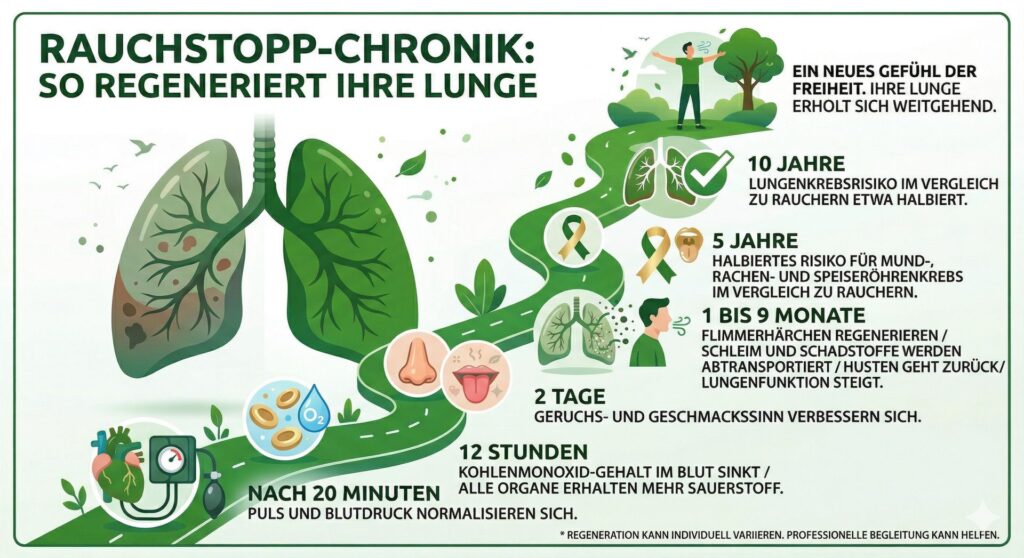 - Nach 1 bis 9 Monaten: Die Flimmerhärchen in den Atemwegen regenerieren sich. Sie können Schleim und Schadstoffe wieder abtransportieren. Hustenanfälle und Kurzatmigkeit gehen zurück, die Lungenfunktion steigt.
